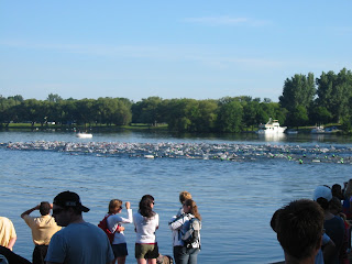 The Swim: My age group is wave 4. (did I mention I hate wave starts??) We started 6 minutes after wave 3, which at the time, I thought was plenty. However, after about 1k we ran into wave 3 and had to play a little dodge swimmer. Other than that, uneventful.